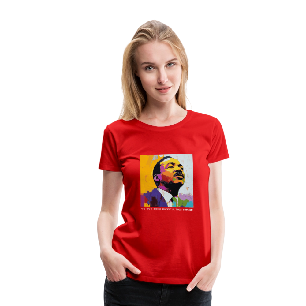 This Dr. Martin Luther King Jr. tee is built for the moment we’re in. Centered on a vivid, abstract portrait of Dr. King with the words “We got some difficulties ahead,” it echoes his final, prophetic speech and the song it inspired. This shirt is a wearable reminder that struggle is real, progress is unfinished, and we still have work to do—together, peacefully, and loudly.